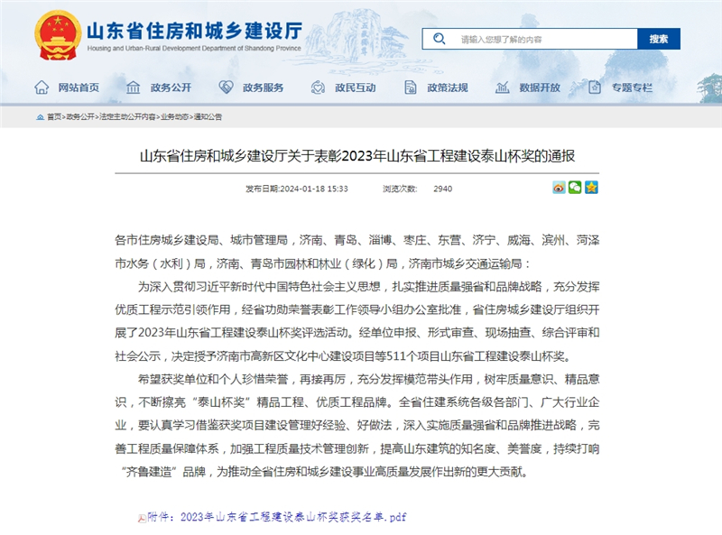 2024年元月18日,山東省住房和城鄉(xiāng)建設(shè)廳通報(bào)2023年“山東省工程建設(shè)泰山杯獎(jiǎng)”獲獎(jiǎng)名單,山東建工集團(tuán)承建參建的6項(xiàng)工程榜上有名,標(biāo)志著集團(tuán)工程質(zhì)量管理水平再上新高度。