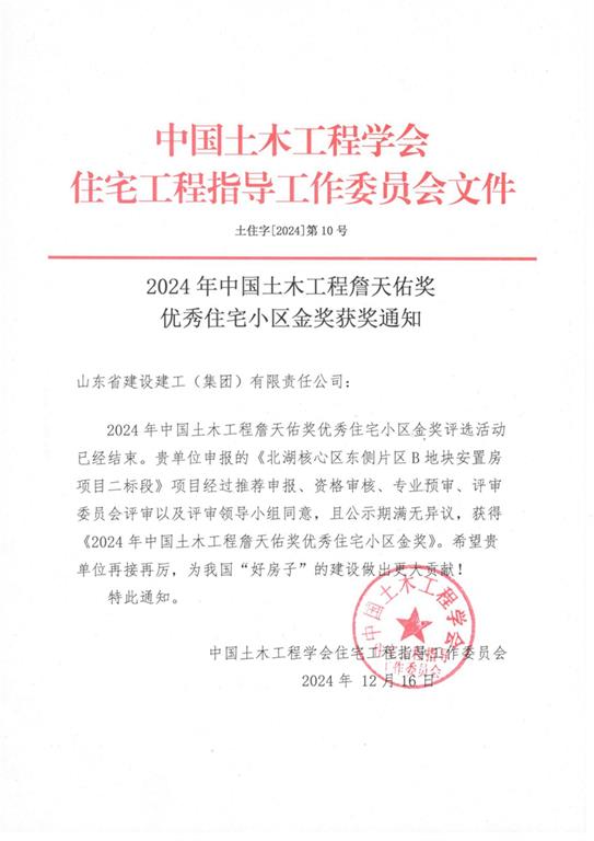 2024年12月,由山東建工集團承建的北湖核心區東側片區B地塊安置房項目二標段獲得中國土木工程詹天佑獎優秀住宅小區金獎。今年全國共48個工程獲獎,集團榜上有名。
